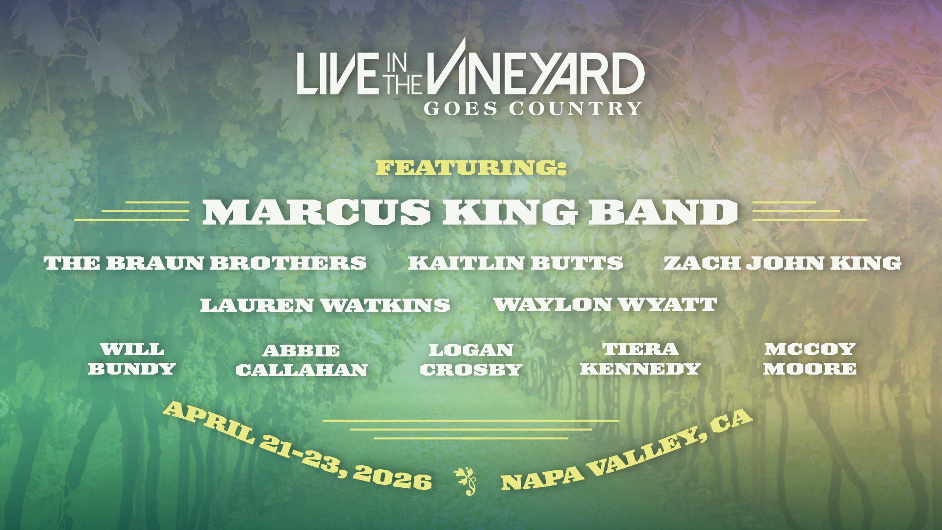Festive All: The Marcus King Band, Kaitlin Butts, Zach John King, Lauren Watkins, Waylon Wyatt, Tiera Kennedy, McCoy Moore and more will perform during the invite-only Live In The Vineyard Goes Country in Napa Valley, CA April 21–23.